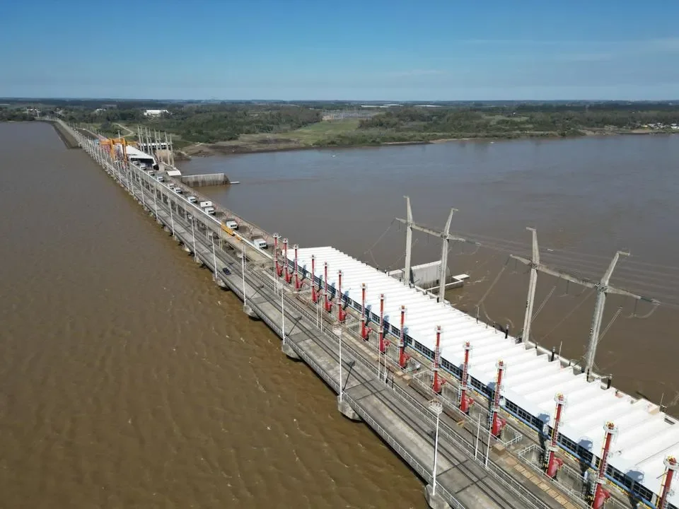 Aerial view of the Salto Grande binational hydroelectric dam on the Uruguay River between Salto in Uruguay and Concordia in Argentina, taken on August 30, 2023. (Photo by Elisa Colella / AFP via Getty Images)